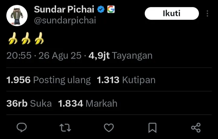 Teknologi.id – Sundar Pichai secara tiba – tiba mengunggah sebuah postingan 3 buah emotikon pisang pada akun media sosial X miliknya. Unggahan tersebut bukan tanpa sebab, diketahui Google meluncurkan alat penyuntingan AI terbaru yang diberi nama dengan “Nano Banana”. CEO Google tersebut sedang merayakan peluncuran AI terbaru dengan caranya sendiri. Google meluncurkan fitur untuk mengedit foto dengan AI terbaru mereka dalam Gemini. Sundar Pichai ternyata sedang memberikan sebuah ‘’kode” pada para pengikutnya tentang Nano Banana.