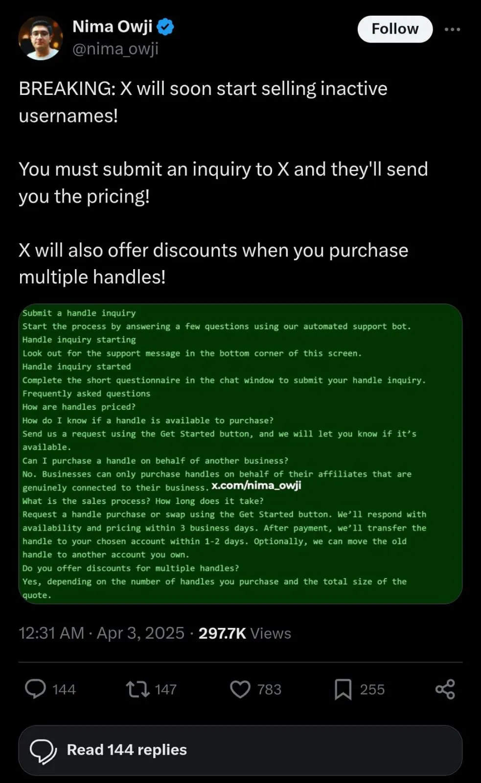 Perusahaan dan organisasi yang telah terverifikasi bisa mengajukan penawaran untuk membeli username X yang tidak lagi digunakan.