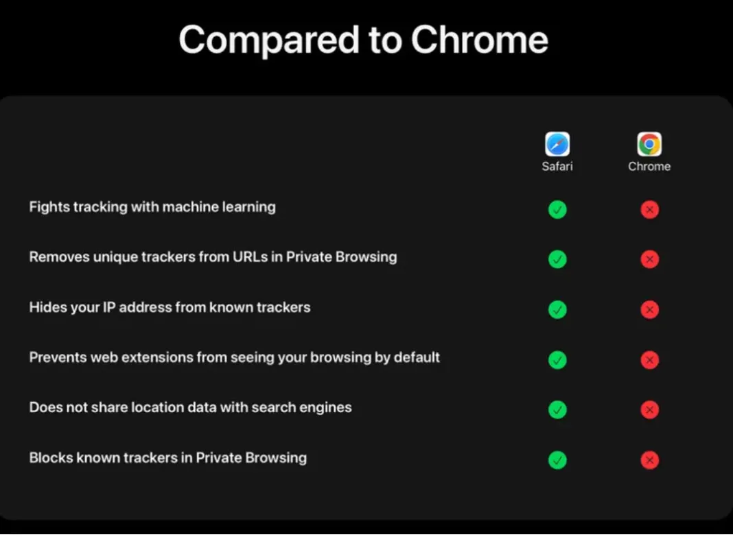 Apple menyebut bahwa kombinasi fitur-fitur ini membuat Safari lebih unggul dalam hal privasi dibanding Chrome dan aplikasi Google lainnya.