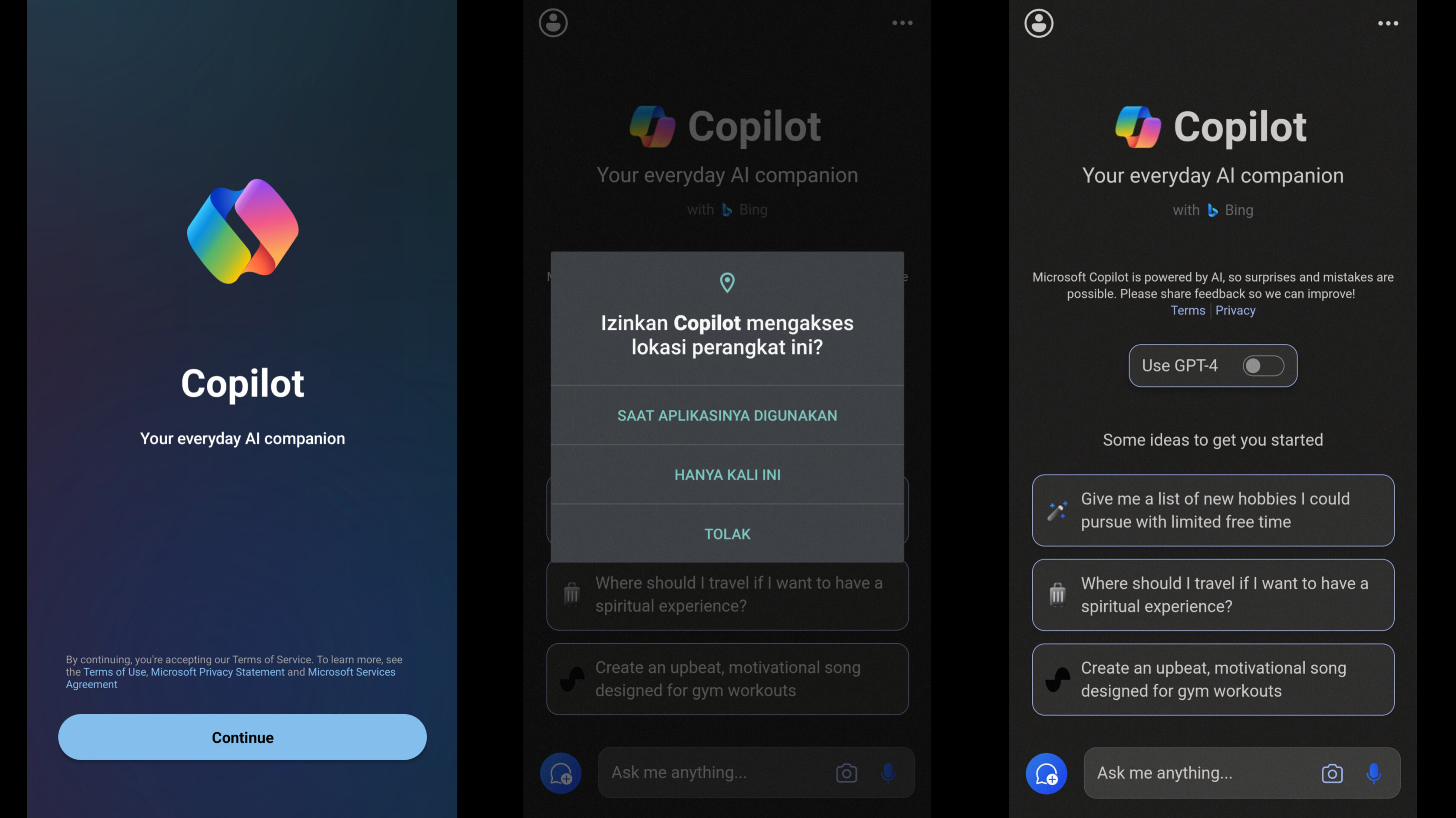 Bagi pengguna Android, setelah mengunduh aplikasi Copilot dan menjalankan aplikasinya, pengguna akan diminta izin lokasi. Sebenarnya, aplikasi tersebut dapat digunakan tanpa perlu masuk ke akun Microsoft. Akan tetapi, pengguna hanya diberi limit untuk mengajukan pertanyaan sebanyak lima kali. Apabila telah melewati limit tersebut, pengguna akan diminta untuk log in ke akun Microsoft. Pengguna yang telah log in menggunakan akun Microsoft akan mendapatkan limit yang lebih banyak dalam mengajukan pertanyaan, yaitu sebanyak 30 kali.