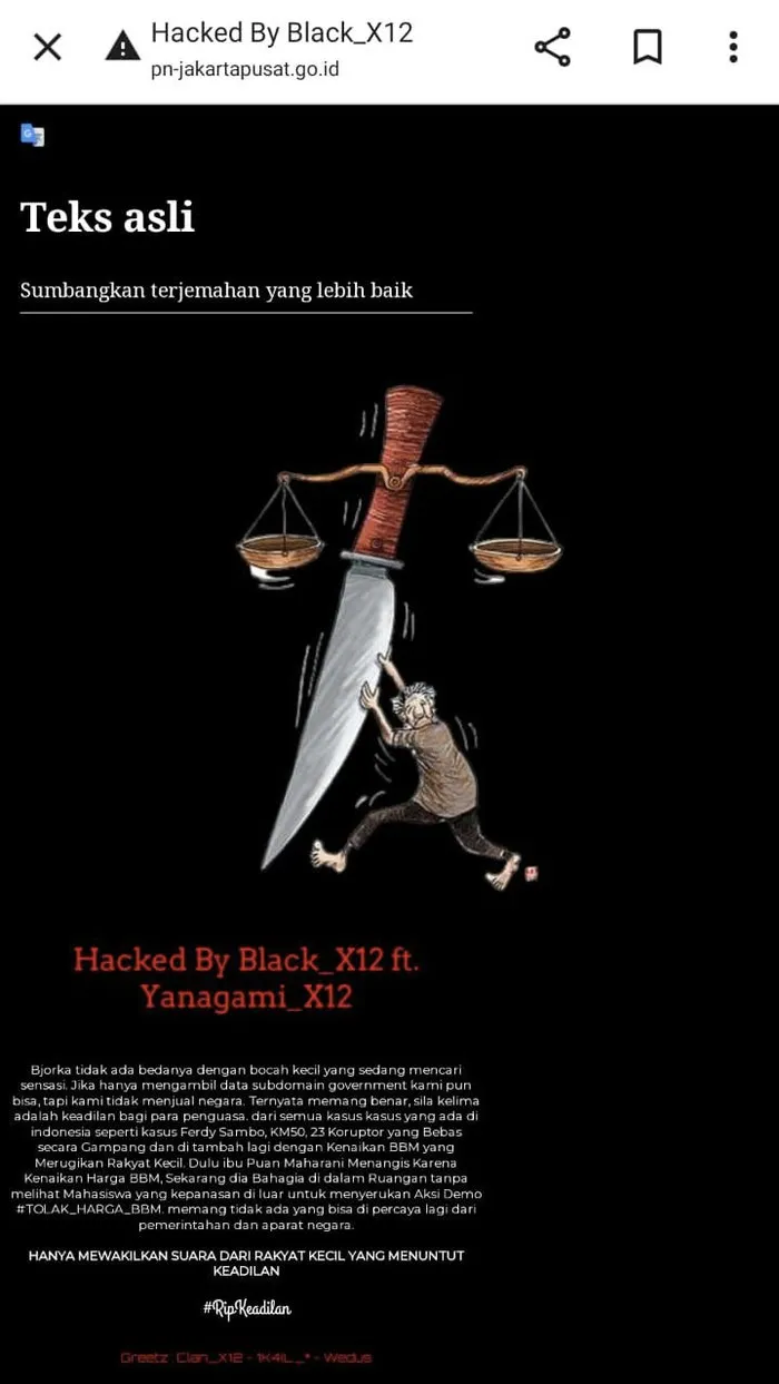 Hacker ini menunjukkan dirinya dengan tulisan yang berwarna merah dan menuliskan pesan cukup panjang untuk dibaca oleh pengakses. Tulisan panjang tersebut membahas tentang kasus Ferdy Sambo hingga kenaikan harga BBM yang turut membawa nama Ketua DPR RI Puan Maharani.