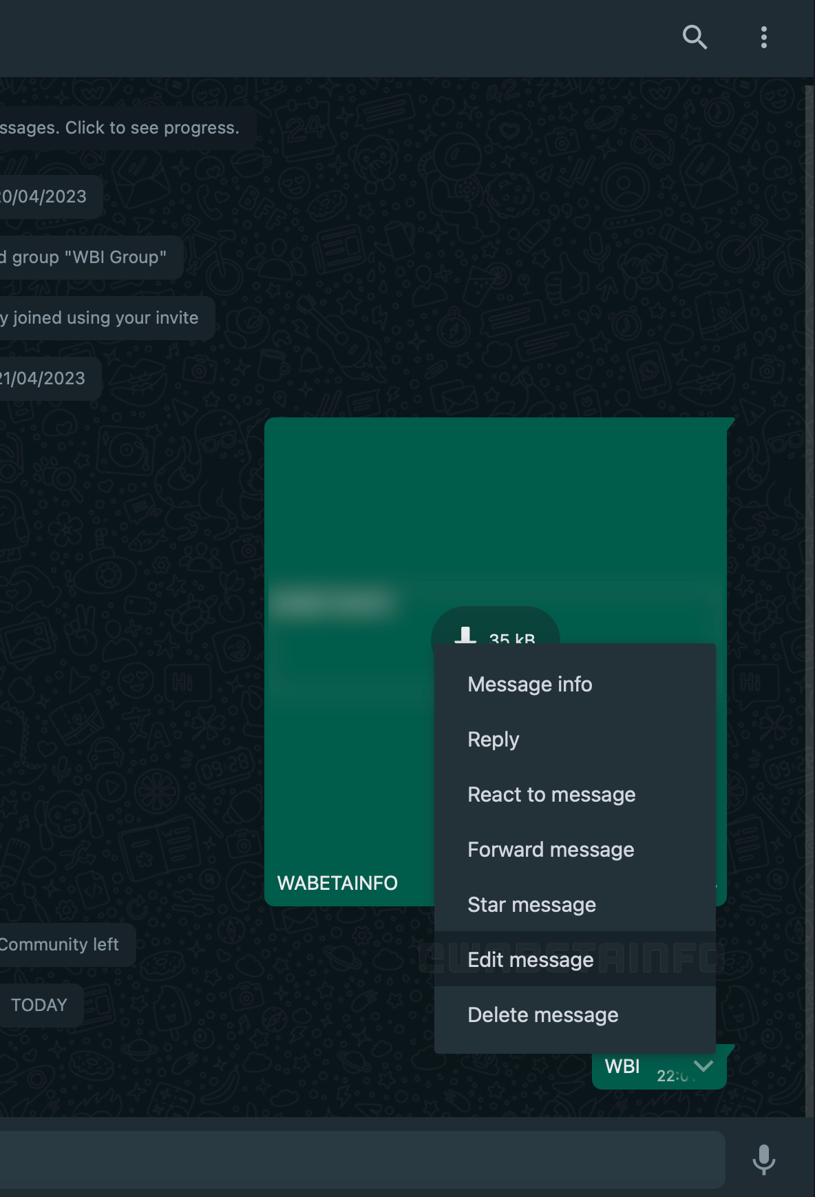 WaBetaInfo merupakan situs yang mengabarkan segala perkembangan terbaru seputar WhatsApp. Melalui situs resmi tersebut, pihak WhatsApp mengumumkan bahwa pengguna WhatsApp Web yang tergabung dalam program beta, dapat melakukan uji coba untuk fitur terbaru mereka, edit pesan. Fitur tersebut dapat diakses dari opsi menu untuk pesan apapun. Pesan yang diedit akan diperbarui untuk semua orang di obrolan, selama mereka memiliki WhatsApp versi terbaru.