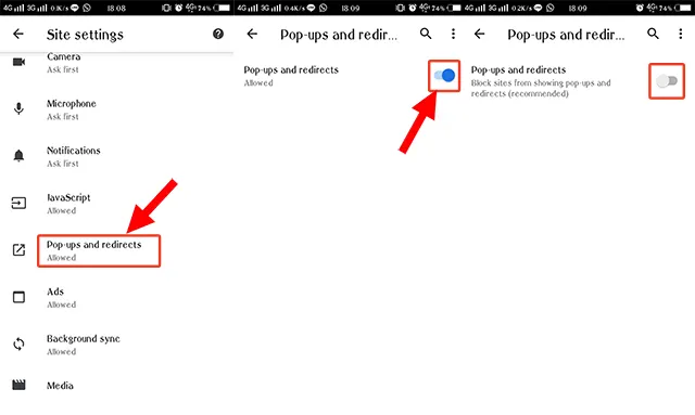 - Ketuk site settings dan pilih pop up and redirects dan ads. Pastikan keduanya tertera kata 'blocked'.