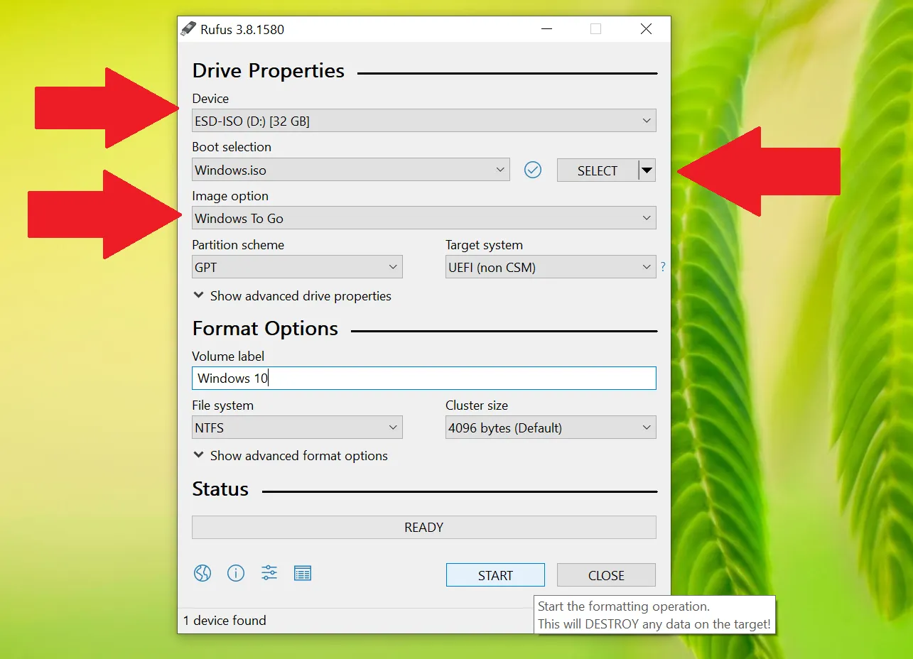 - Kemudian, unduh Rufus, klik mulai, dan pilih drive USB milikmu di menu dropdown "Device".
