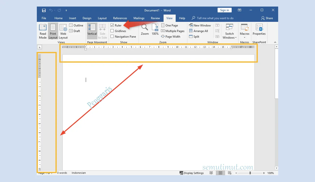 - Jika penggaris vertikal tidak muncul, pastikan kamu berada dalam tampilan 'Tata Letak Cetak'.Namun jika masih tidak muncul, kamu mungkin harus mengaktifkan rules.