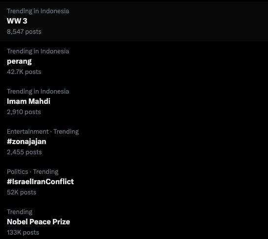 Di platform X (sebelumnya Twitter), topik “World War 3” atau Perang Dunia III mendadak menjadi trending topic global. Ribuan pengguna menyuarakan kecemasan mereka, mulai dari nada satir hingga benar-benar ketakutan atas skenario konflik berskala dunia.
