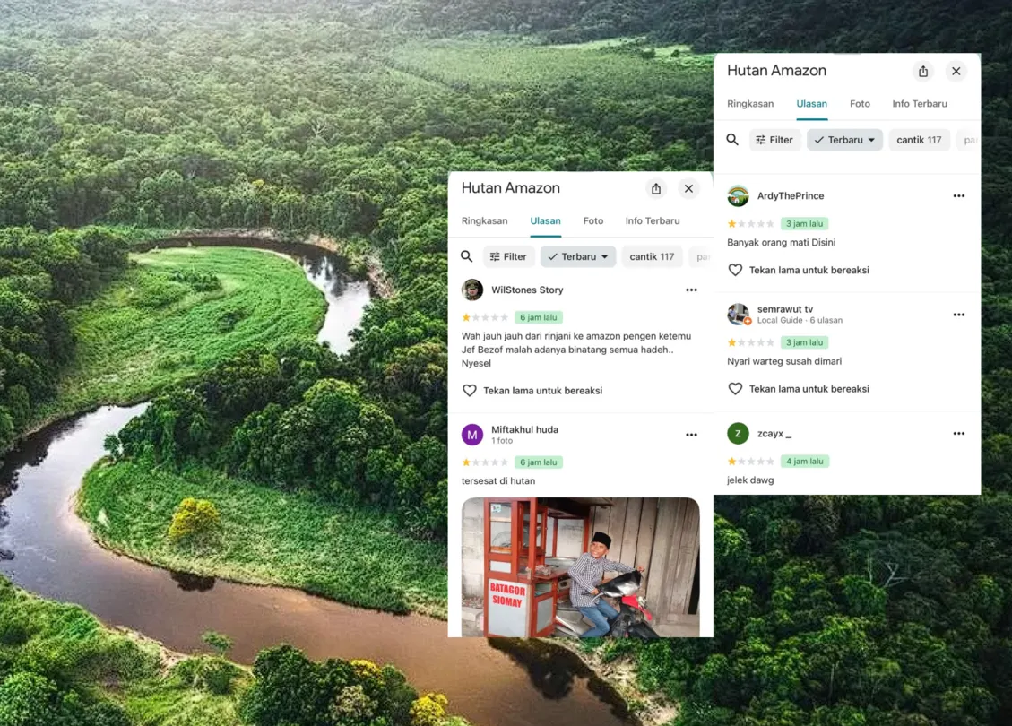 Beberapa bahkan menyisipkan foto selfie atau pemandangan Gunung Rinjani saat menulis ulasan untuk Hutan Amazon, menunjukkan bahwa aksi ini memang lebih ke arah trolling daripada protes serius.