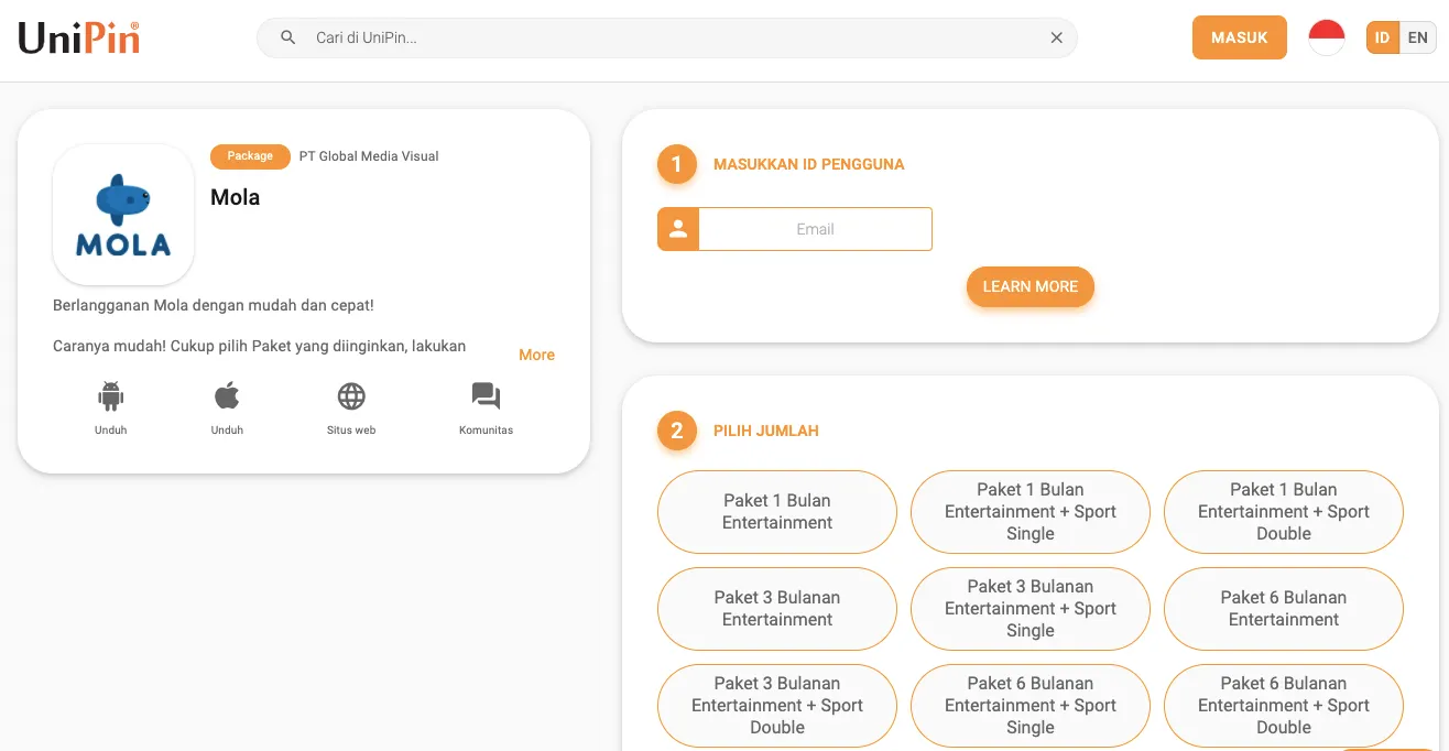- Buka web UniPin.com, lalu masuk ke halaman langganan Mola TV.