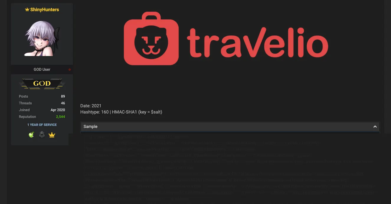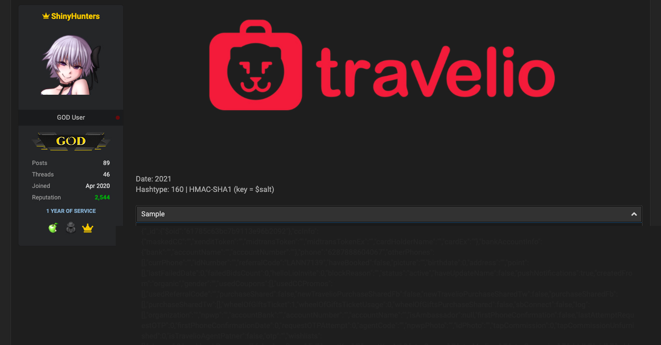 Terpantau sejak 23 November 2021, data pengguna Travelio disebut dipajang oleh akun "ShinyHunters" di situs jual-beli data RaidForums.