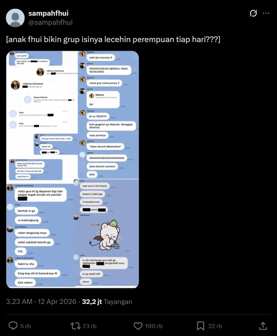 "Yang bikin miris, mereka ini calon orang hukum, harusnya paling paham soal etika, martabat, dan konsekuensi hukum. Tapi malah normalize pelecehan tiap hari. Lama-lama jadi budaya, dan itu bahaya banget." cuit pengguna X @guudlucking.