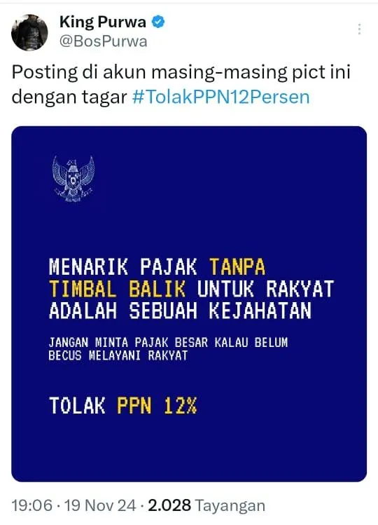 Salah satu warganet dengan akun @BriteSmg949 menulis, “Rakyat Indonesia bersatu tolak PPN 12%! Pemerintah tidak becus urus negara! Kenapa lebih dari 80% pendapatan negara adalah dari pajak? Kalian kemanakah sumber daya alam Indonesia? Masuk kantong pejabat?”