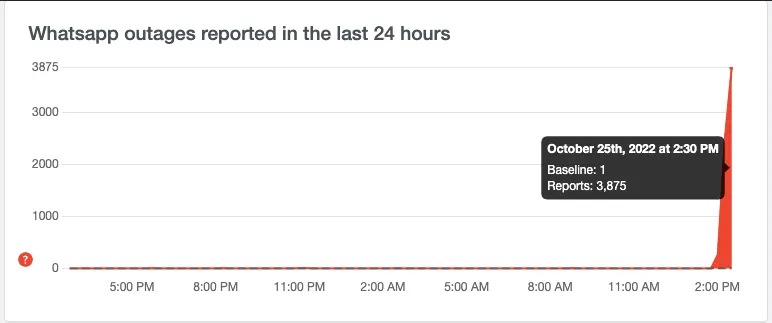 Situs navigasi platform Down Detector menunjukan laporan WhatsApp error meningkat pada pukul 14.30 sebanyak 3.875 laporan. Para pengguna WhatsApp tidak bisa mengirim pesan baik teks maupun media lewat WhatsApp di grup percakapan (WhatsApp Group).