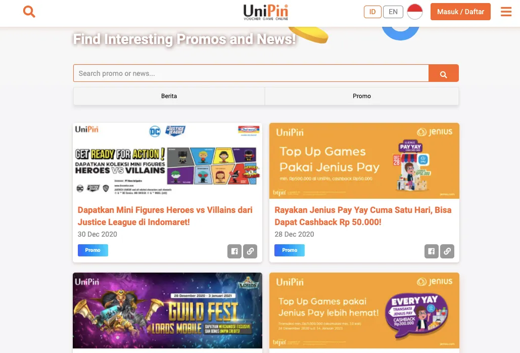 Cara pertama adalah yuk buka dan kunjungi terus website UniPin.com. Setiap harinya akan ada promo terbaru yang bisa kamu temukan. Selengkapnya kamu bisa cek halaman berita & promo di UniPin.com. Di sana akan ada info promo-promo terbaru. Promonya bisa berupa promo cashback, bonus pembelian, dan banyak lagi.
