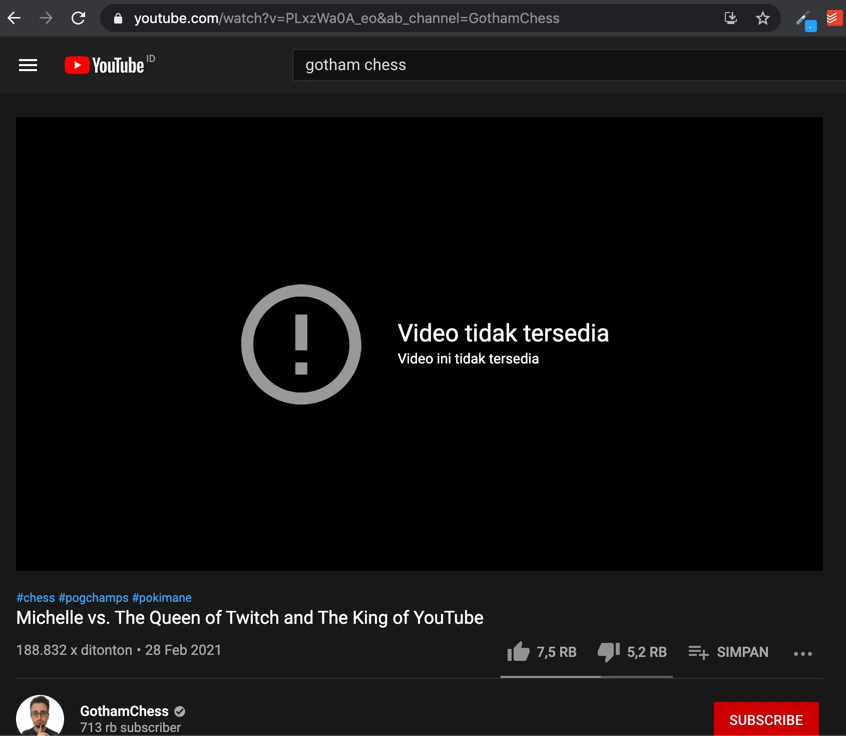 Meski begitu, bila mencari dengan cara biasa, kamu akan menemukan video-video milik GothamChess, namun tidak bisa diakses dengan keterangan, "Video ini tidak tersedia".