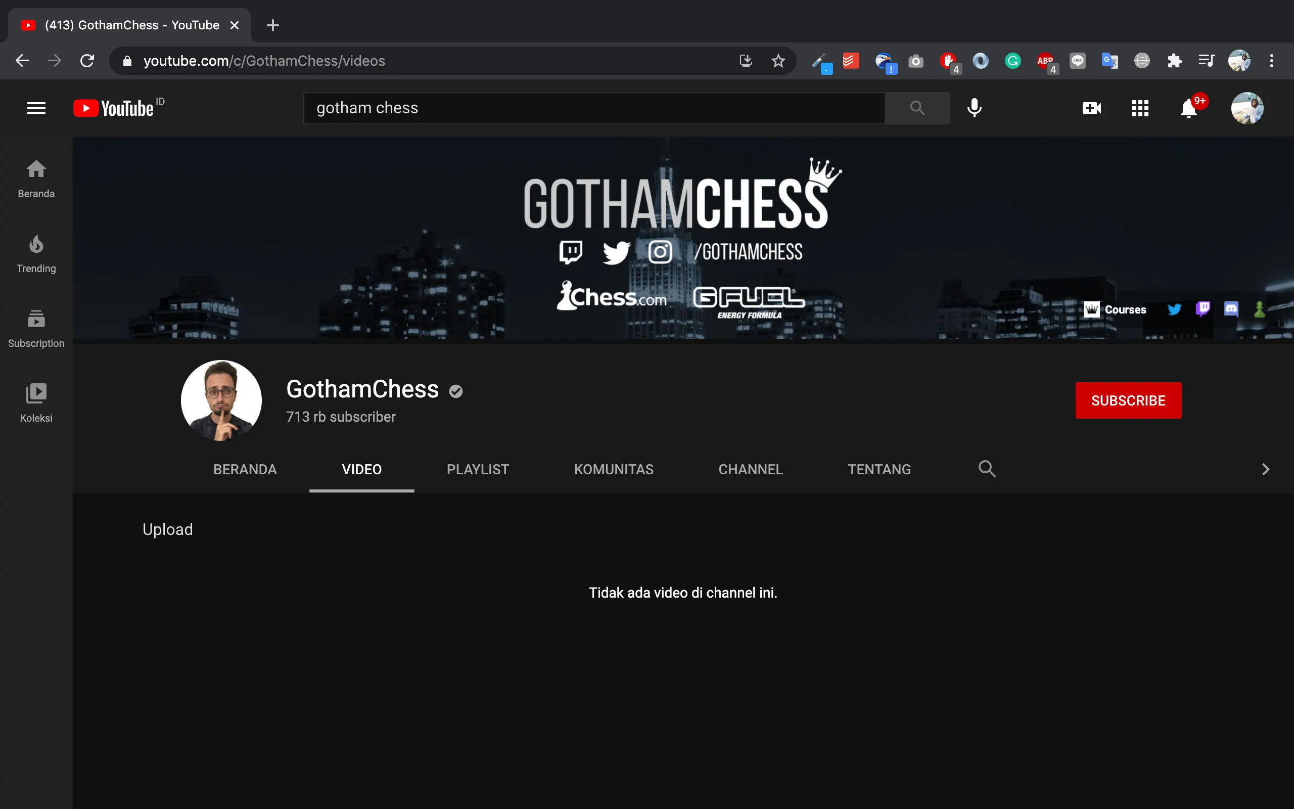 Kini bila mengunjungi channel YouTube GothamChess, kamu tidak akan bisa mengakses video-video miliknya dan hanya akan muncul keterangan "Tidak ada video di channel ini"