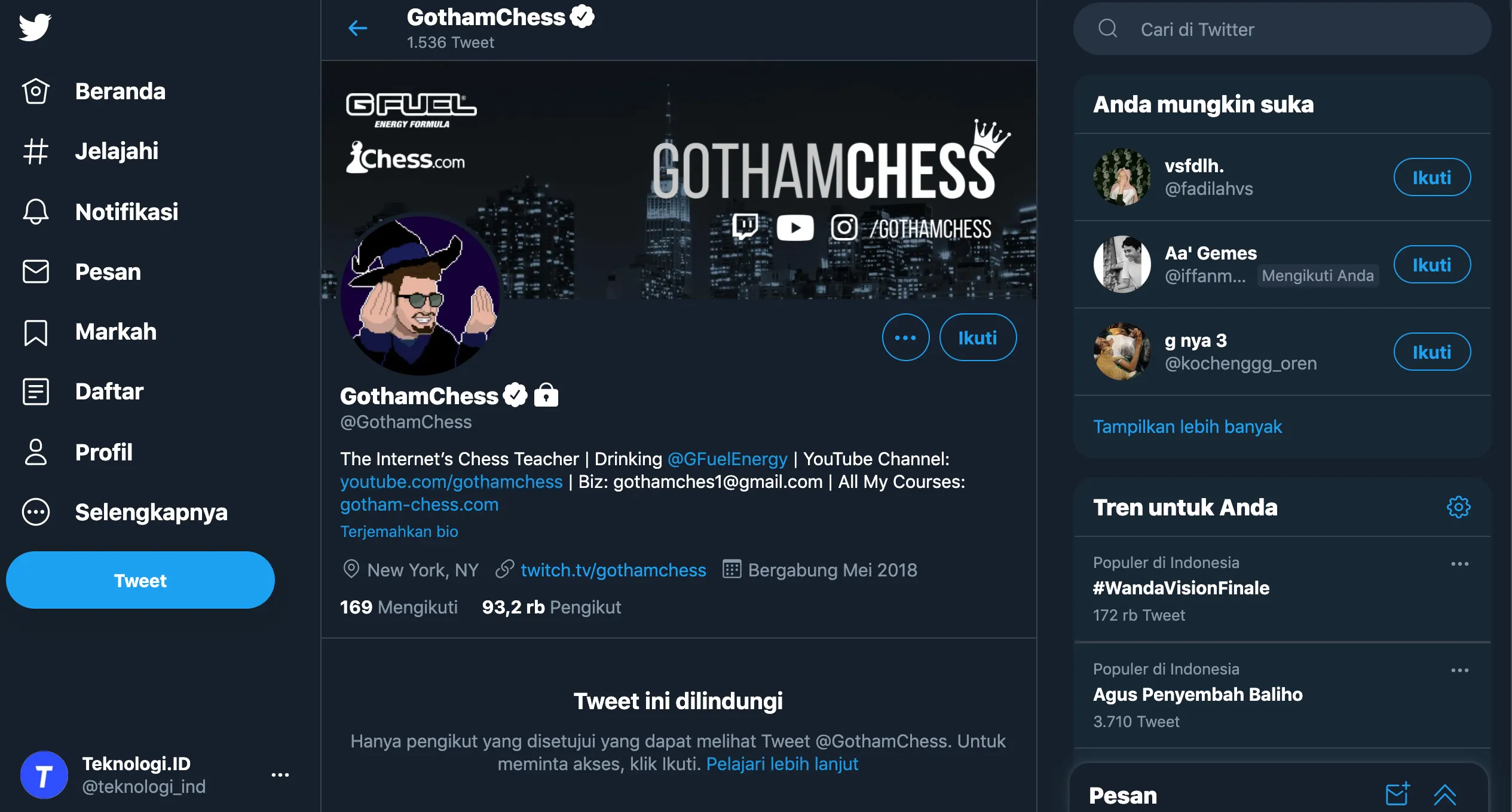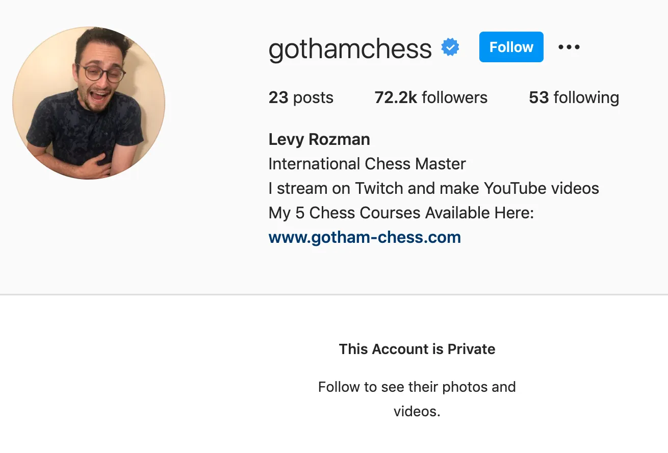 Berdasarkan pantauan Teknologi.id, Jumat (5/3/2021), Levy Rozman saat ini telah menggembok akun GothamChess miliknya yang ada di Twitter maupun di Instagram.
