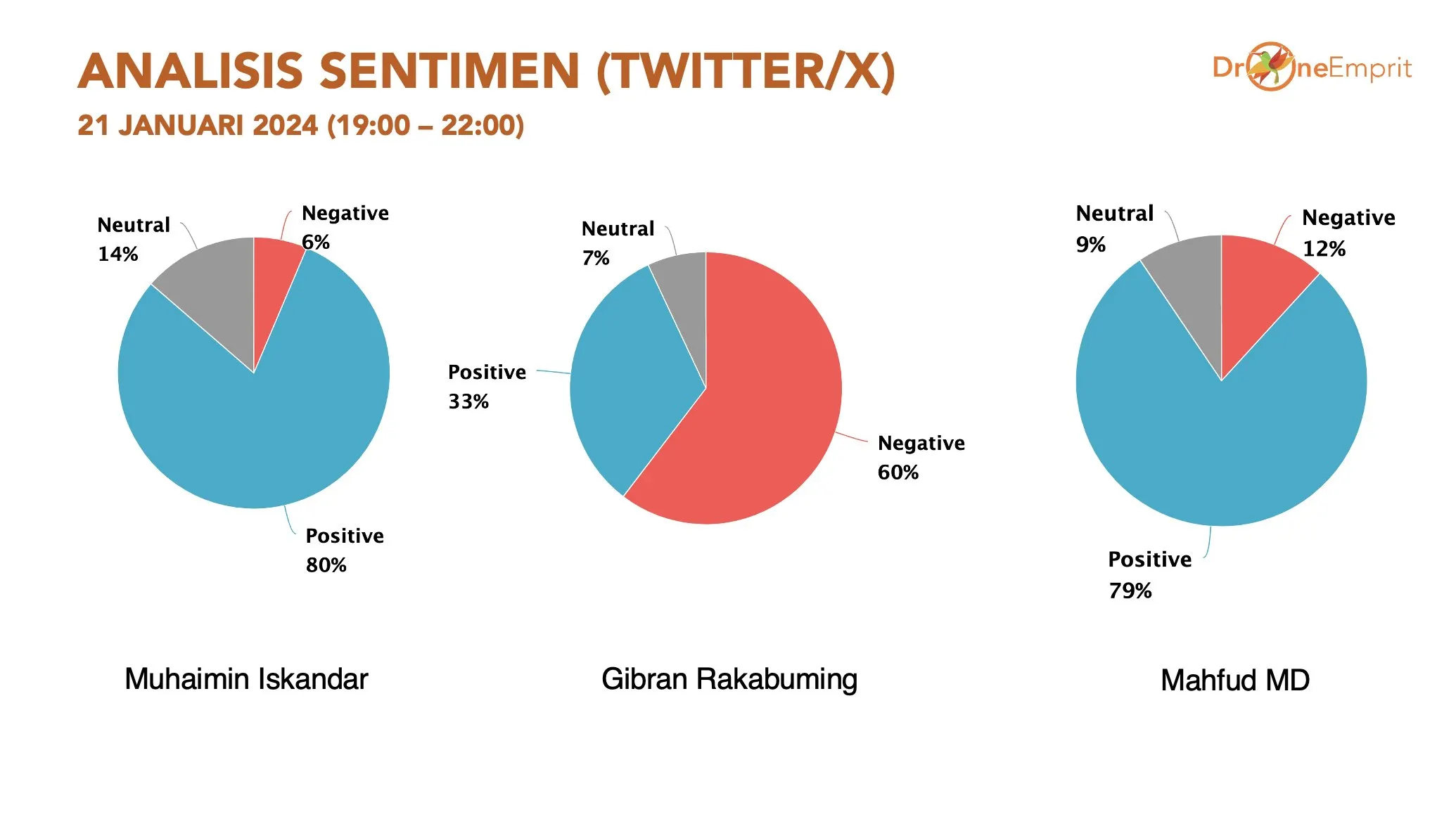 Dari hasil yang sudah dilakukan Drone Emprit, Muhaimin Iskandar, mendominasi sentimen positif dengan 80% percakapan yang mengarah ke arah yang baik. Hanya 6% yang negatif dan 14% yang netral. Berdasarkan data ini, ditarik kesimpulan bahwa Cak Imin memiliki dukungan yang sangat kuat dan citra yang positif di media sosial.