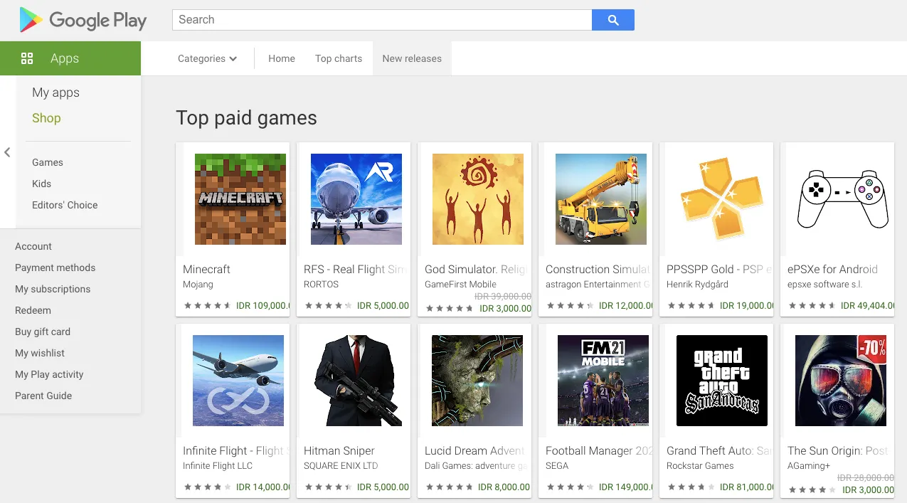 Untuk mengisi waktu luang, kita bisa bermain game. Baik itu game gratis ataupun game berbayar. Salah satu platform yang dapat kita gunakan untuk membeli game adalah Google Play. Khususnya jika kamu adalah pengguna Android. Ada banyak game Android yang bisa kita beli di Play Store. Beberapa contoh game populer berbayar yang ada di Play Store misalnya: Minecraft, GTA San Andreas, Football Manager, dan banyak lagi.