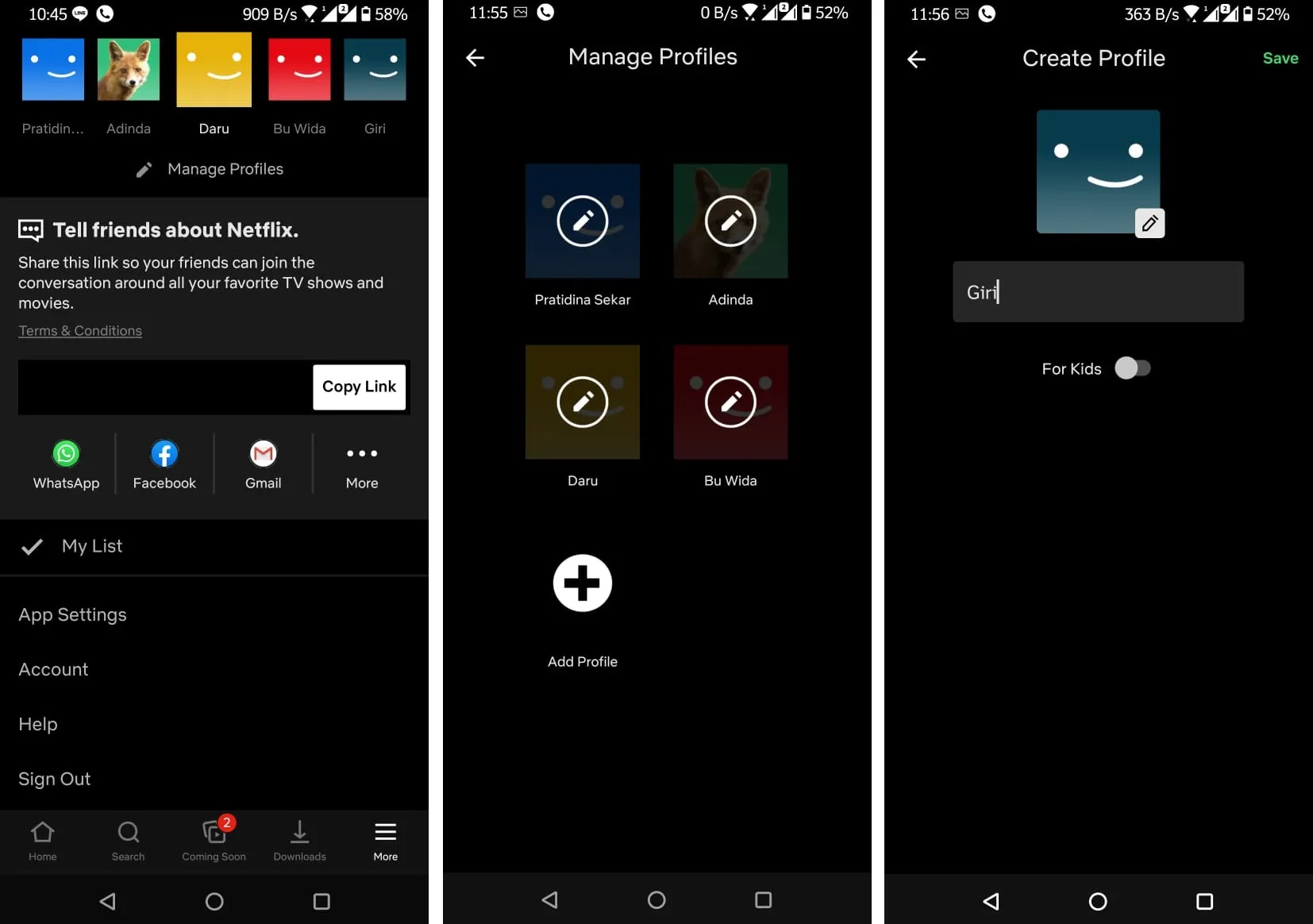 Saat baru masuk ke dalam aplikasi Neflix di smartphone, pilih tombol "More" di bagian sudut kanan bawah. Kalian akan dialihkan ke halaman untuk menambahkan profil. Pilih menu "Kelola Profil" di bagian atas. Kemudian, di halaman selanjutnya pilih "Tambahkan Profil" dan buat profil khusus untuk anak. Kalian juga dapat memberikan nama dan profil foto.