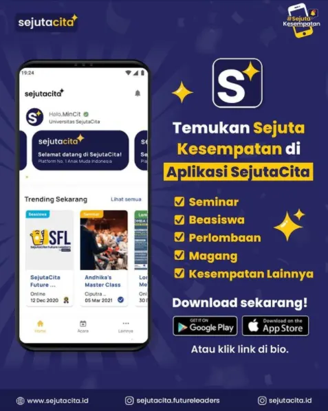 Aplikasi SejutaCita kini sudah tersedia untuk perangkat berbasis Android dan iOS. Beragam acara berkualitas dan berbobot sudah dikurasi dalam satu aplikasi ini, mulai dari informasi magang, beasiswa, lomba-lomba, beasiswa hingga kegiatan relawan.