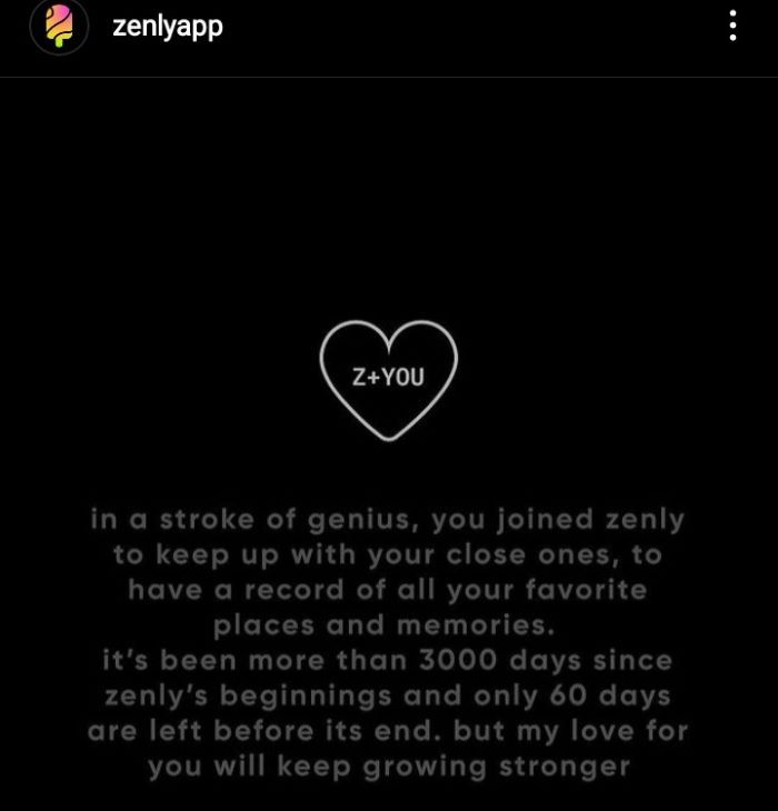 "Dengan sangat jenius, kamu bergabung dengan zenly untuk mengikuti orang-orang terdekat Anda, untuk mencatat semua tempat dan kenangan favorit Anda. Sudah lebih dari 3000 hari sejak dimulainya zenly dan hanya tersisa 60 hari sebelum berakhir," bunyi pengumuman tersebut. .