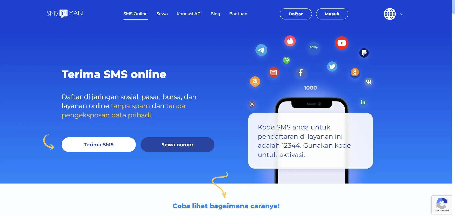 Layanan SMS OTP dengan fungsionalitas untuk pendaftaran di berbagai platform internet.