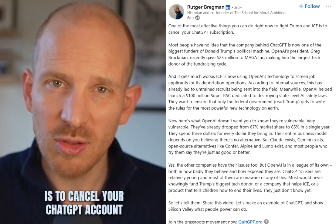 Sejarawan sekaligus penulis dan pendiri The School of Moral Ambition, Rutger Bergman, secara terbuka mengajak masyarakat untuk melakukan boikot. Dalam sebuah video di LinkedIn, ia menyatakan, "Cara paling berdampak untuk melawan kebijakan deportasi Trump adalah dengan membatalkan akun ChatGPT Anda," katanya