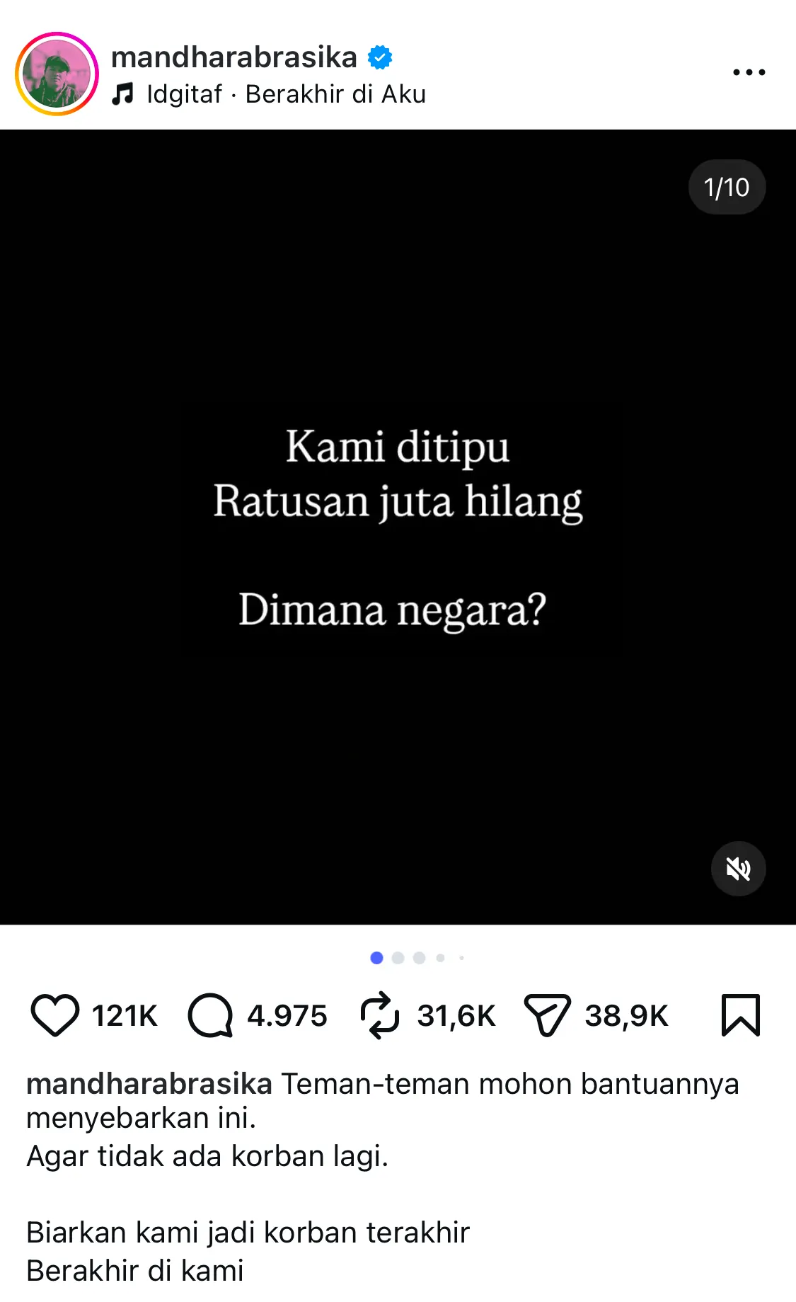 Kasus penipuan siber berskala besar ini pertama kali mencuat dan menyita perhatian publik setelah korban membagikan pengalaman buruknya melalui media sosial. Pengguna platform Instagram dengan nama akun @mandharabrasika menceritakan secara detail bagaimana dirinya baru saja tertipu ratusan juta rupiah. Melalui keterangan (caption) pada unggahannya, ia meminta masyarakat untuk menyebarkan informasi tersebut seluas-luasnya, dengan harapan besar agar tidak ada lagi masyarakat yang jatuh ke dalam lubang penipuan serupa.