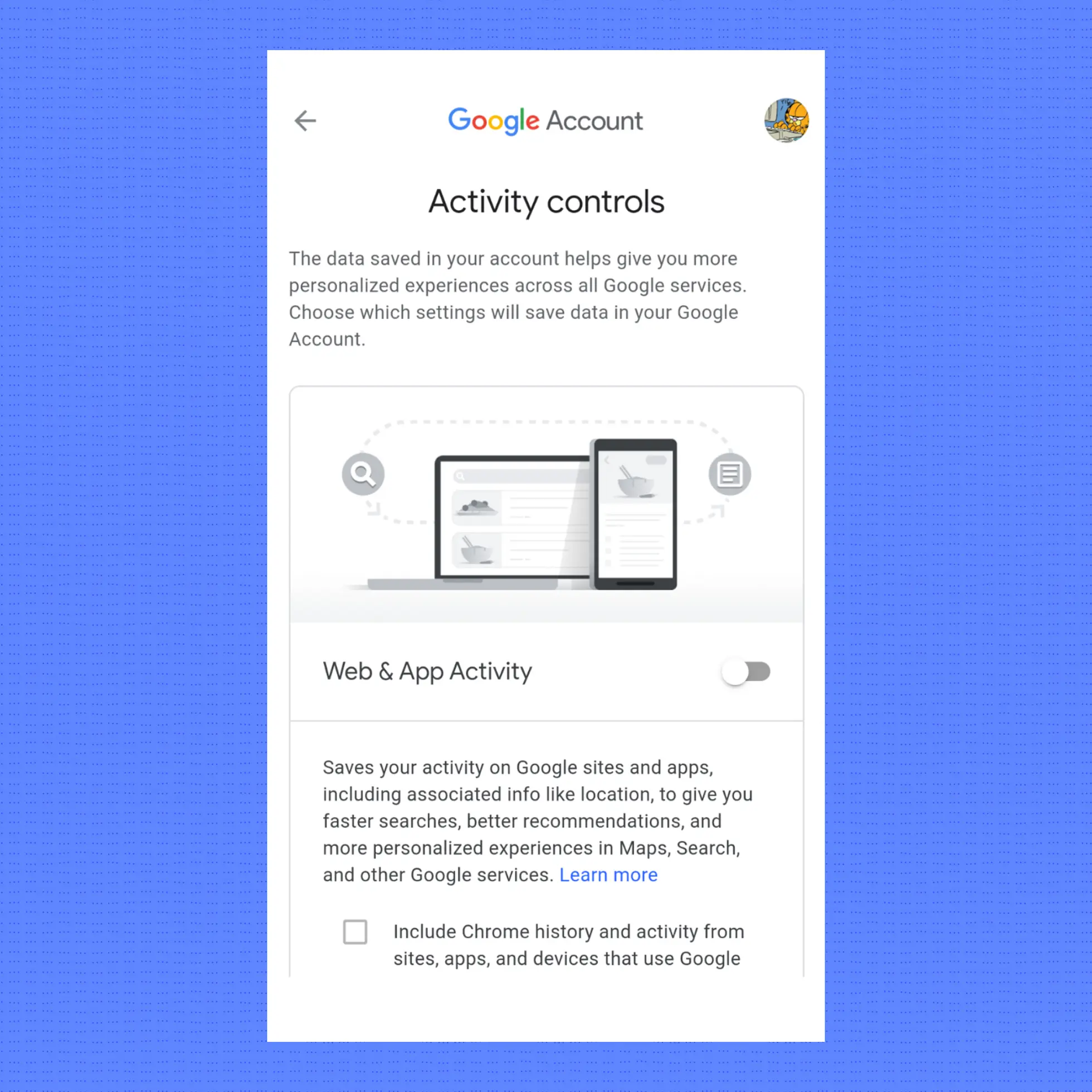 Google merupakan salah satu aplikasi yang mengambil data privasi paling banyak pada ponsel Android. Kamu bisa mengontrolnya langsung melalui akun Google (tidak terikat dengan jenis ponsel). Kalian bisa menggunakan fitur Google's Privacy Checkups untuk mengontrol data; aktivitas web, riwayat lokasi, riwayat pencarian dan nonton Youtube, iklan hasil personalisasi, lokasi Google Photos, dan lainnya.