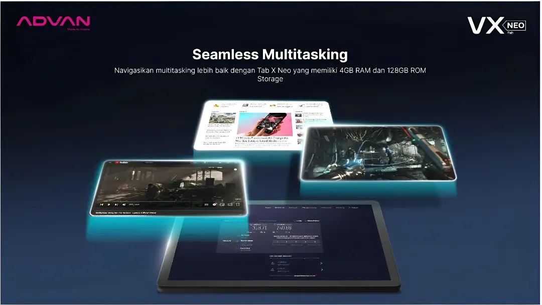 Advan Tab A10 menonjol dengan layar 10.1 inci rasio 4:3 yang luas dan sistem operasi Android 14 yang bersih. Di sisi lain, Advan Tab VX Neo menawarkan baterai jumbo 6200 mAh dan dukungan stylus pen serta keyboard, menjadikannya pengganti laptop yang praktis untuk mobilitas tinggi.