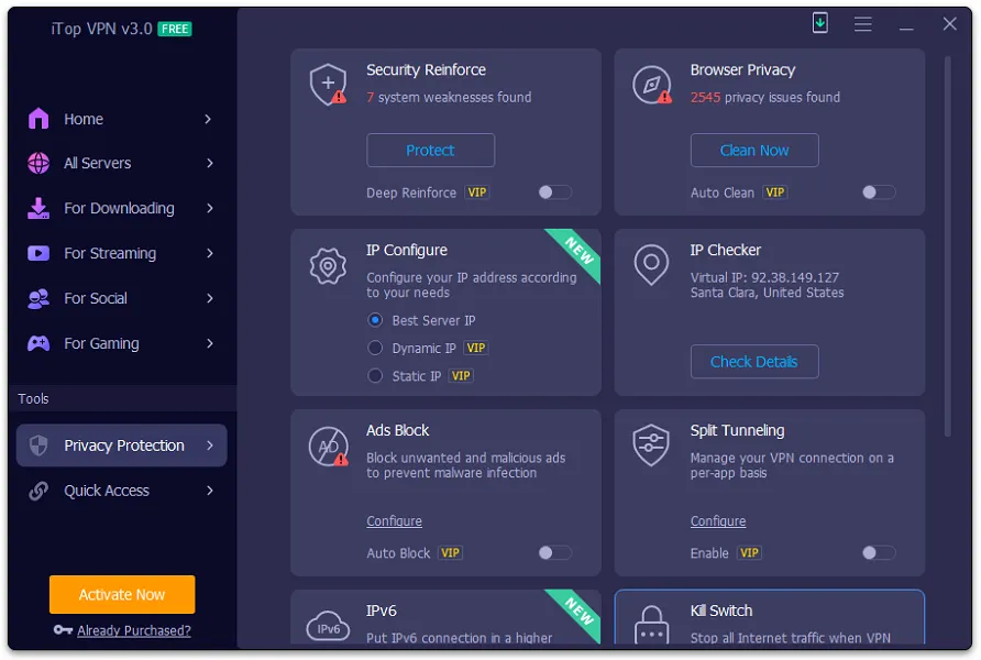 Selain itu, iTop VPN juga menyediakan 10 tools yang berguna untuk meningkatkan level keamanan selama kita online. Tools tersebut bisa melindungi kita dari DNS attacks, auto cleans privasi browsing, menon-aktifkan koneksi internt dengan Kill Switch, memungkinkan kamu untuk mengonfigurassi alamat IP kamu sebagai alamat IP statis atau dinamis, dan juga menyediakan alat pengecek alamat IP gratis.