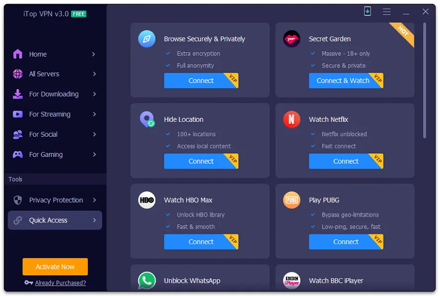 Tanpa VPN, pasti banyak situs yang tidak bisa kita akses atau situs yang hanya menyediakan sedikit layanan untuk wilayah kita. Dengan iTop VPN, kamu bisa membuka block berbagai situs seperti situs streaming yang tidak tersedia di Indonesia, contohnya BBC iPlayer, Hulu, HBO Max, Paramount Plus, dan Peacock streaming. Selain situs streaming, iTop VPN juga bisa membantu kamu membuka fitur-fitur games seperti PUBG,Roblox, dan Call of Duty Warzone, yang mungkin belum tersedia di Indonesia lengkap dengan memperbaiki ping problems. iTop VPN tentu saja juga bisa membuka situs-situs spesial yang ingin kamu nikmati sendirian. Menggunakan iTop VPN juga bisa membantu kamu menikmati konten dari luar negeri dari situs streaming seperti Netflix, Disney Plus, dan media social seperti WhatsApp, Telegram, Skype,Facebook, Twitter, dan lainnya. Fitur yang ingin kamu gunakan juga bisa kamu pilih sesuka hati di bagian menu.