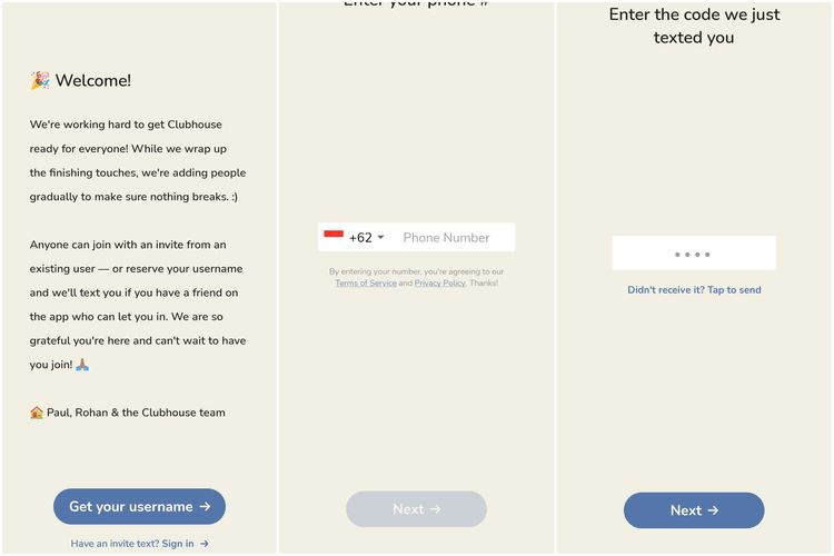 Clubhouse Android tetap harus memiliki undangan untuk masuk. Caranya dengan meminta pengguna Clubhouse untuk mengundang yang nantinya juga akan masuk melalui SMS.