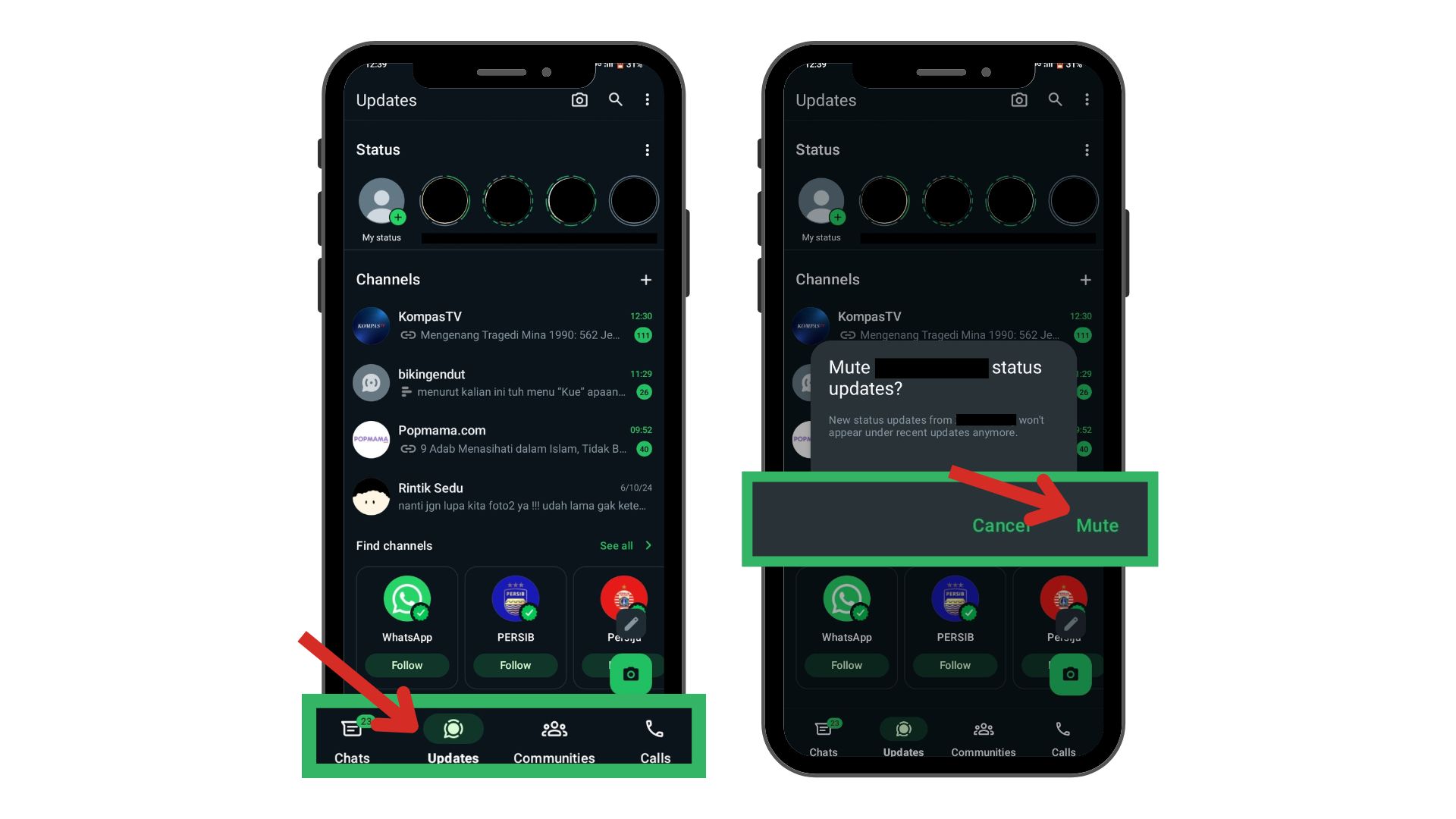- Pilih tab "Updates/Pembaruan" yang biasanya berada di bagian atas atau bawah layar, tergantung pada versi WhatsApp yang Anda gunakan.