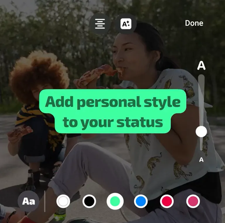 Secara keseluruhan, tampilan dari pembaruan fitur WhatsApp Status ini sangat mirip dengan Instagram Stories. Di bagian bawah layar, pengguna dapat memilih warna font yang tersedia, mulai dari putih, hitam, biru, hijau, merah, merah muda keunguan, dan banyak lagi. Dengan adanya pilihan font dan warna yang lebih beragam ini, WhatsApp memberikan keleluasaan bagi pengguna untuk mengekspresikan diri mereka dengan lebih kreatif dan menarik.
