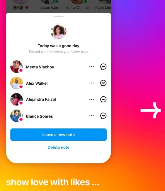 Instagram juga menambahkan kemampuan bagi pengguna untuk bereaksi dengan cepat terhadap catatan teman mereka dengan suka. Untuk menyukai catatan, pengguna akan diminta untuk mengklik ikon hati dilembar balasan atau cukup mengetuk dua kali catatan tersebut seperti yang mereka lakukan pada gulungan atau kiriman.