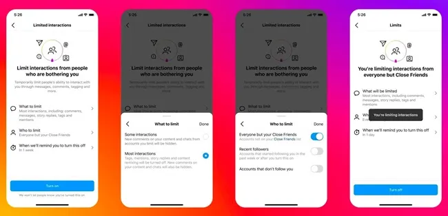 Pengguna dapat membatasi interaksi mereka "Pengguna Instagram" untuk teman dekat atau hanya menjeda untuk pengikut terbaru dan akun yang tidak mengikuti mereka.