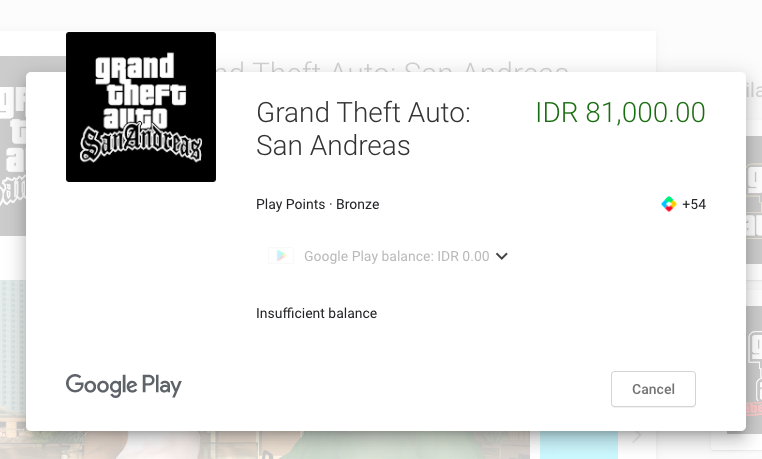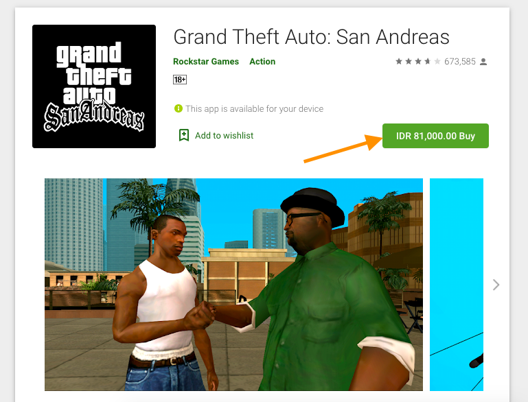 2. Jika metode pembayaran sudah siap, kamu tinggal buka Play Store lalu masuk ke halaman game yang akan dibeli. Misal kalau mau beli game GTA San Andreas, kamu bisa masuk ke halaman game tersebut.