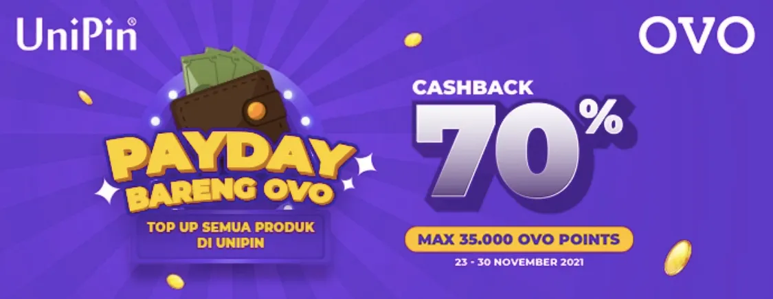 Yang perlu kamu lakukan adalah lakukan top up game di UniPin dengan metode pembayaran OVO cash. Kamu bisa dapat cashback 35.000 berupa OVO Points dengan minimum transaksi OVO Cash sebesar Rp50,000. Promo ini berlangsung dari 23 - 30 November 2021 di jam 10:00 – 23:59 WIB.