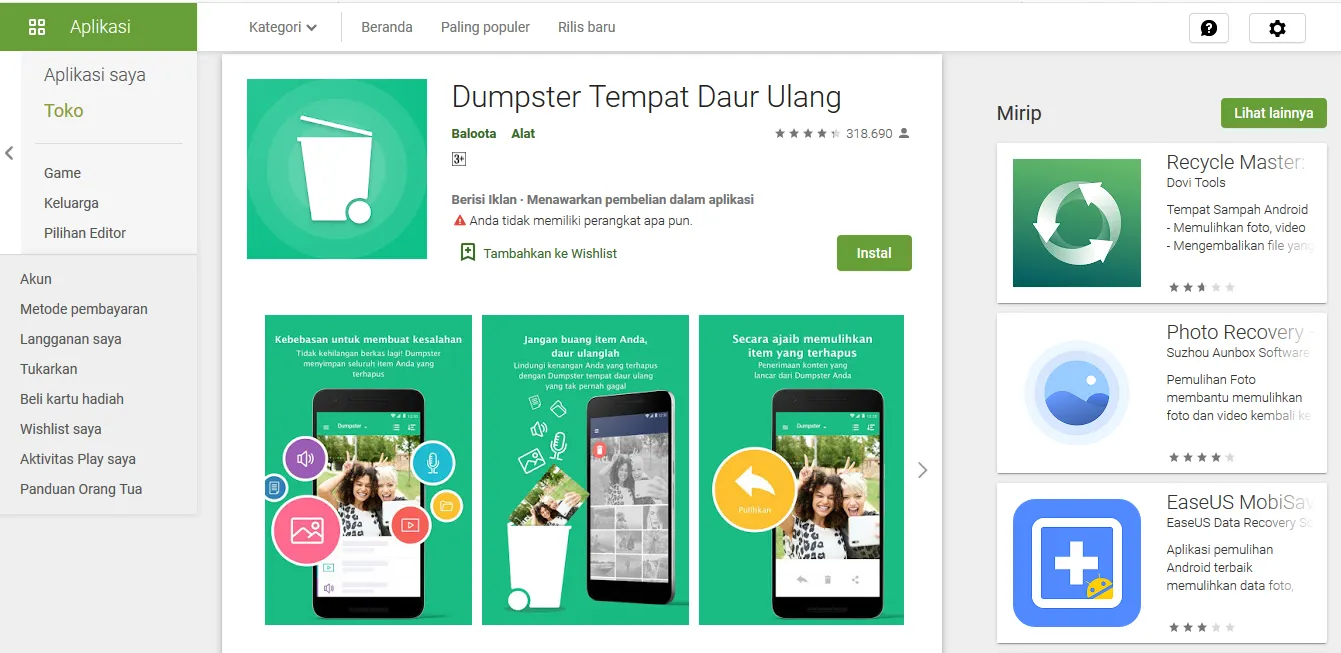 Tangkapan layar Dumster di toko aplikasi Play Store