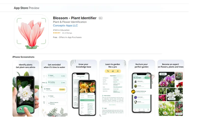Aplikasi ini tidak memiliki fitur mewah seperti pengukur cahaya dan rekomendasi tanaman, tetapi aplikasi ini mampu memberikan deskripsi dengan jelas. Blossom memiliki database lebih dari 10.000 tanaman indoor, yang masing-masing dilengkapi dengan halaman tentang preferensi untuk cahaya, tanah, air, suhu, kelembaban, pot, dan perbanyakan tanaman.