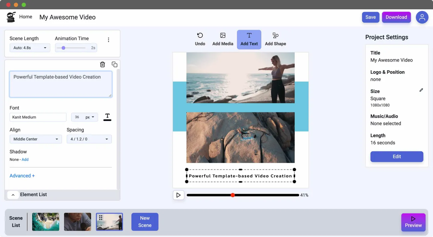 Fitur utamanya mudah digunakan termasuk storyboard yang penuh dengan stok gambar, video, musik, template video, dukungan berbagai macam format video serta kemampuan untuk mengekspor video dengan resolusi tinggi.