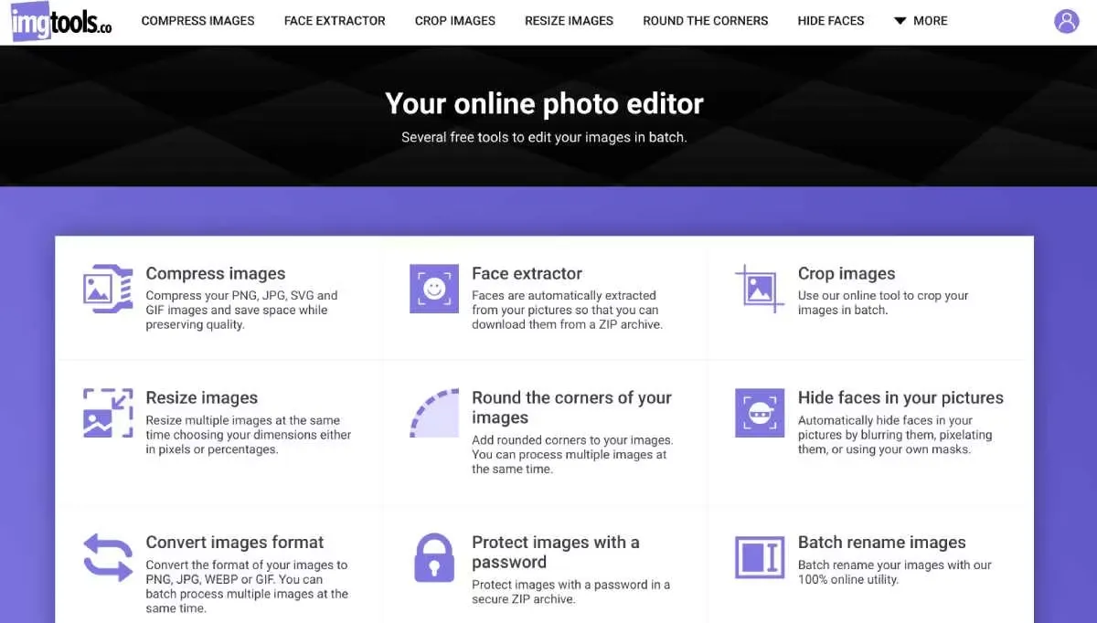 ImgTools mendukung PNG, JPG, GIF, SVG, WebP, TIFF, dan format file PSD. Kamu dapat mengunggah dari hard drive kamu, atau juga melalui Google Drive atau Dropbox. Saat ini, ImgTools menawarkan 12 jenis opsi pengeditan gambar: kompres, konversi, ekstrak wajah, hide faces, potong, ubah ukuran, rounded corners, ganti nama, blur, putar, dan ekstrak bingkai dari animasi GIF.