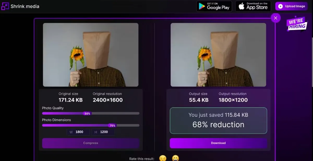 Aplikasi yang masih saudaraan dengan Upscale.media, Shrink.media justru sebaliknya. Kamu dapat mengambil gambar resolusi tinggi (hingga 5000x5000 piksel) dan mengompresnya menjadi gambar yang jauh lebih kecil dan lebih ringan tanpa kehilangan kualitas.