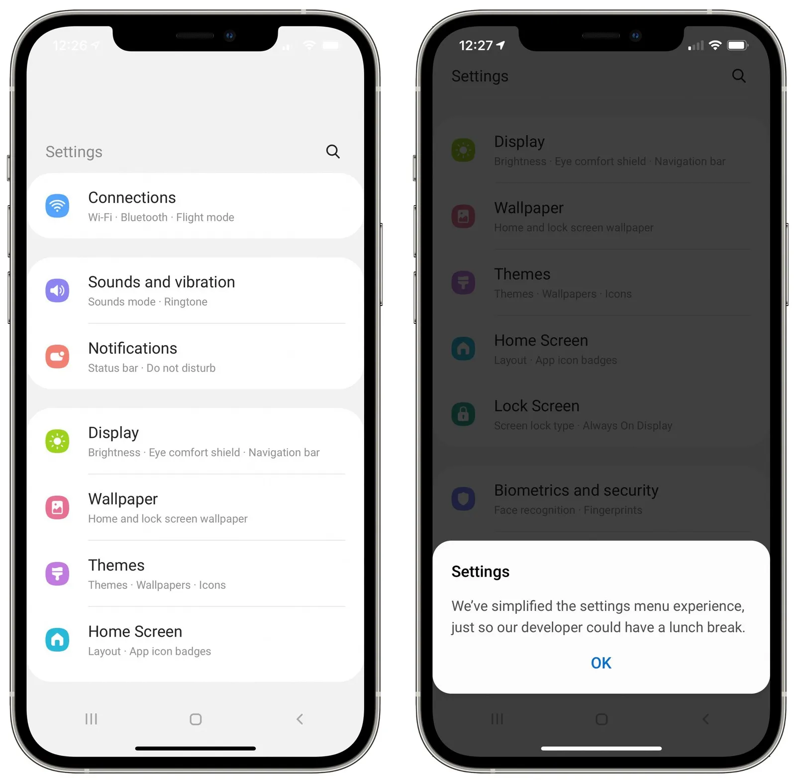 Selain itu, ada juga beberapa fitur yang tidak bisa diakses dan hanya menampilkan gambar. Tapi Samsung mencoba membumbuinya dengan sedikit humor, seperti saat membuka aplikasi Settings tertulis, ada beberapa pengaturan yang disederhanakan "Agar developer kami bisa istirahat makan siang."