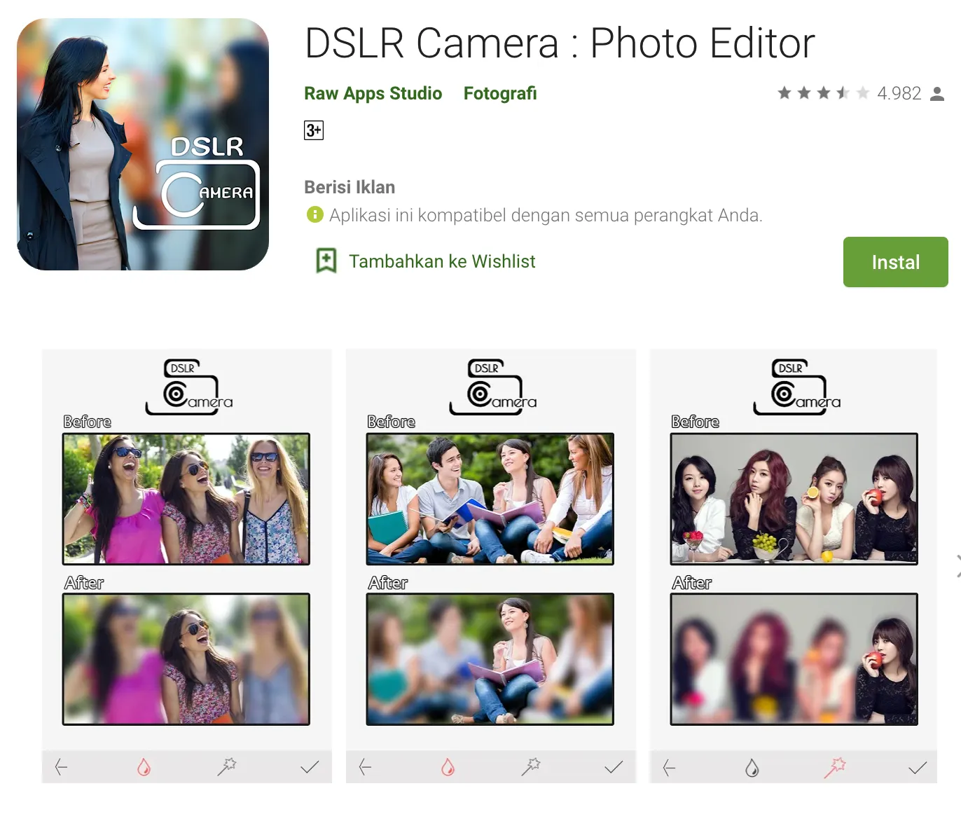 Berbeda dengan deretan aplikasi sebelumnya, DSLR Camera: Photo Editor adalah aplikasi editing foto yang bisa membuat kualitas foto seperti dijepret dengan kamera DSLR. Kalian bisa memberikan efek blur pada bagian latar belakang dan memilih area mana yang ingin ditonjolkan. Fitur lain yang akan kalian dapatkan adalah pengaturan kontras, exposure, warna gambar, dan lain-lain.