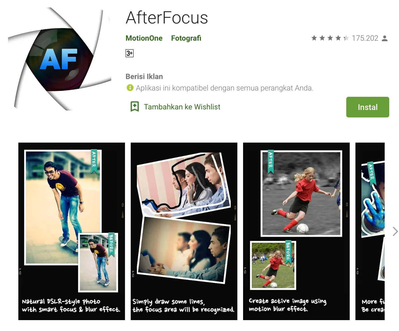 Aplikasi berikutnya berasal dari MotionOne, yaitu AfterFocus. Keunggulan dari aplikasi ini adalah ia menawarkan hasil gambar dengan efek bokeh atau latar belakang blur.