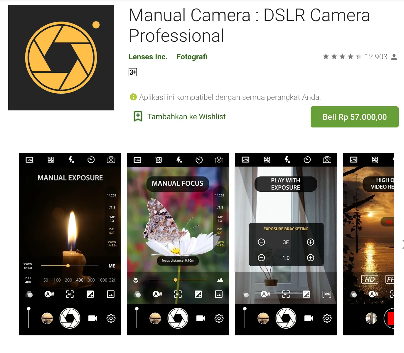 Apa yang terbesit di pikiranmu ketika mendengar kata manual camera? Tentunya kamera DSLR dan kamera profesional lainnya, kan? Aplikasi ini memiliki fitur yang mirip dengan DSLR.