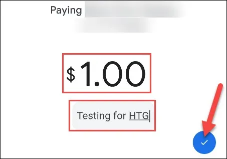 Ketikkan jumlah nominal uang yang ingin Anda kirim dan tambahkan catatan tentangnya. Ketuk tanda centang biru setelah selesai. Lalu, pesan pop-up konfirmasi akan muncul. Anda dapat memilih metode pembayaran lain jika Anda mau. Jika orang tersebut tidak ada dalam daftar kontak Anda, Google akan mengingatkan Anda untuk memastikan infonya dengan benar.