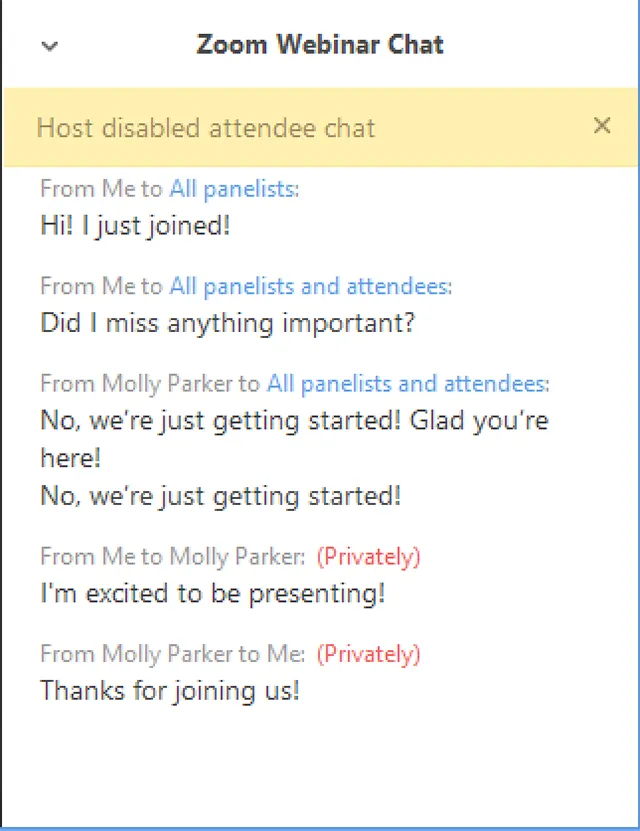 Meskipun host tidak bisa mengecek pesan pribadi, pesan tersebut masih bisa tersebar jika pengguna tidak berhati-hati dalam membagikan chat log-nya pada orang lain. Akan lebih bijak untuk tidak mengirimkan pesan yang sensitif melalui pesan pribadi di Zoom.